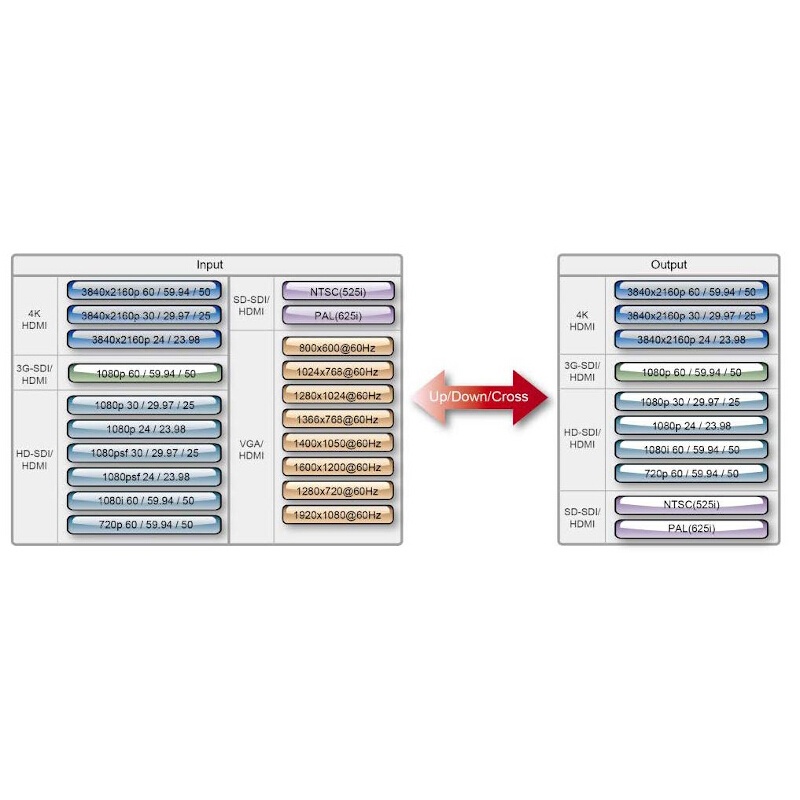 Convert VGA, HDMI, and SDI inputs (with audio) to 4K HDMI or 3G-SDI output
