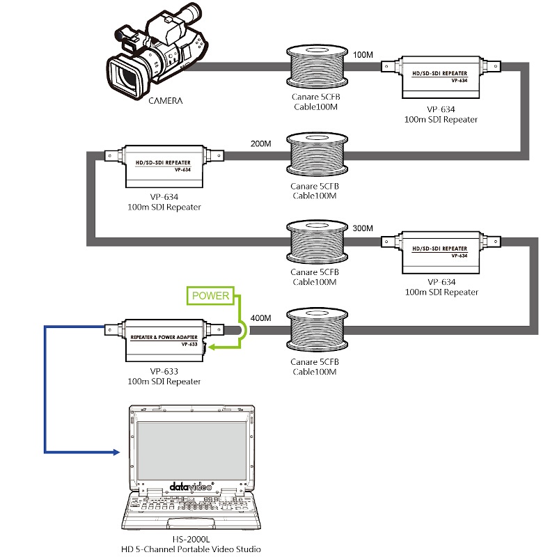 If you want to extend the signal even further, instead of adding another VP-633 at the end of the first 328 ft, you can connect a slightly less expensive VP-634. The VP-634 does not have a power input like the VP-633 model. The VP-633 is the device closest to your switcher, with up to three VP-634 devices extending the chain. The VP-634 features reclocking, and supports embedded audio.
