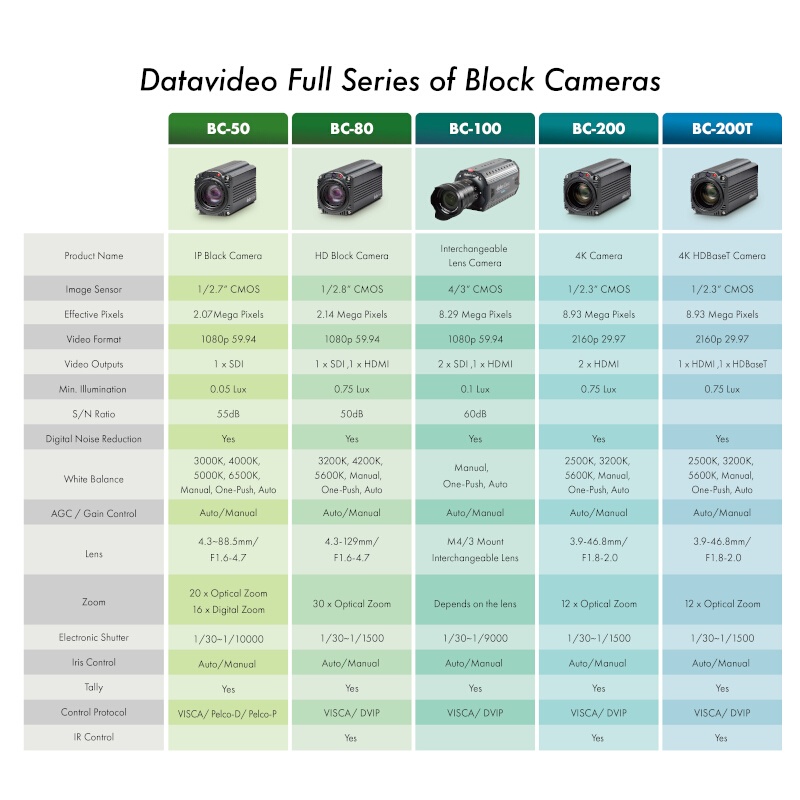 Datavideo's BC-50 1080p HD Block Camera captures up to 1080p60 resolution video and allows you to output the signal via a 3G/HD/SD-SDI port to connect it to a switcher or other broadcast device. You can also simultaneously stream the signal to RTMP destinations in up to 1080p60 over an Ethernet port. Moreover, you can transmit a second stream in up to 720p60 resolution over the same Ethernet port. The camera offers up to 20x optical and 16x digital zoom, adjusting from a 4.3 to 129mm focal length. The BC-50 is designed for applications requiring fixed camera positions, such as certain indoor sports (like table tennis), TV studios, or virtual studios. To use it in PTZ operations, you can incorporate the optional PTR-10 Robotic Pan and Tilt Head from Datavideo.