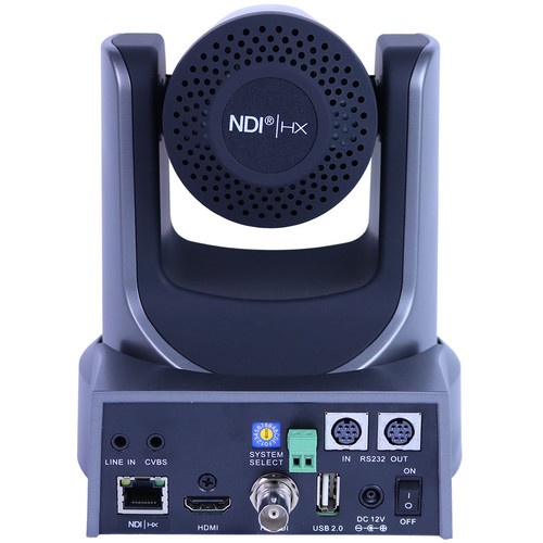 The 30X-NDI Broadcast and Conference Camera, in gray, from PTZOptics, allows you to output up to a 1080p signal simultaneously via HDMI, SDI, and NDI or IP outputs (NDI and IP share the same RJ45 port). You can select 1080p60 for SDI and HDMI and up to 1080p30 for NDI/IP, or 1080p60 for NDI/IP and 1080p30 for SDI and HDMI. The NDI protocol, NewTek's innovative IP technology, gives you low-latency access to audio and video devices anywhere on your network for various A/V applications. You won't be restricted to sources connected directly to a single system. The 30X-NDI comes with a NewTek NDI license, so you're set to go right out of the box. The camera also has a composite output that can be used on its own (without any of the other outputs at the same time) to deliver 576i/480i resolution.