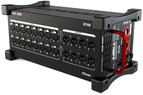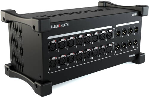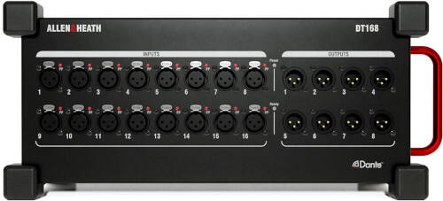 The Allen & Heath DT168 is a 16x8 Dante/AES67 audio I/O expander offering tight integration with dLive and SQ Series mixers for live stage applications such as houses of worship, concert venues, and theaters. It features 16 low-noise microphone preamps and eight line outputs, all on balanced 3-pin XLR connectors. 48V phantom power is selectable per input while 16 LEDs indicate the phantom power status for all inputs. 32-bit / 96 kHz converters deliver the detailed audio quality and high resolution that modern productions demand.