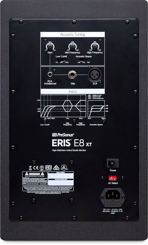 Modern recording studios can be anywhere from a spare bedroom to a multi-million dollar facility. That's why every studio monitor we make is equipped with controls that ensure the flattest response in your mix environment. Acoustic tuning controls allow you to configure the Eris E8 XT perfectly for your room: You get Low-cut, Mid, and High controls, as well as 3-way Acoustic Space tuning that allows you to easily compensate for the sonic consequences of speaker placement against a wall or in a corner.Studio monitor connections.