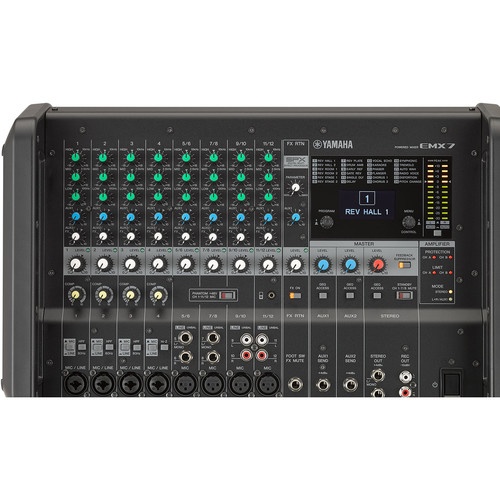 The Yamaha EMX7 is a 12-input powered mixer with an integrated 1420W amplifier, eight mic/line inputs, four stereo line inputs, and two Aux sends. The mixer features a Hi-Z guitar input on channel four and each channel offers a 3-band EQ for custom tailoring your sound. Channels 1-4 offer XLR-1/4" combo jacks. Channels 5 through 12 provide mono XLR inputs, with channels 5-8 offering 1/4" inputs and 9-12 offering an additional set of stereo RCA inputs. Channels 11/12 also include an 1/8" stereo mini-jack for connecting portable music players.