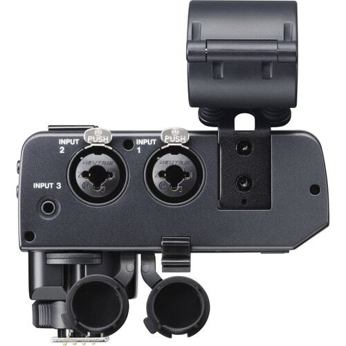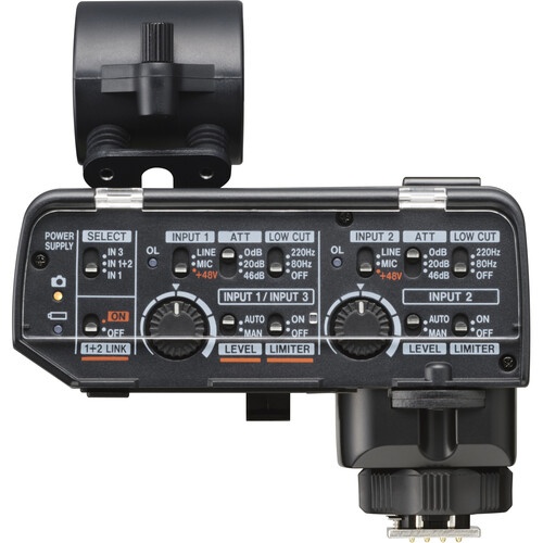 A cold shoe on the top panel expands setting flexibility. The shock mount mechanism is vibration resistant, noise-friendly and allows connection of various microphones. Two XLR/TRS input terminals and one 1/8-inch stereo mini microphone input terminals supports multiple shooting scenarios. CA-XLR2d has the flexibility that adapts to the gear necessary for the job.
