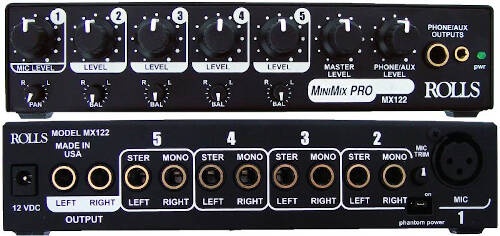 The MX122 is a five channel audio mixer which combines a single microphone signal with four stereo instrument or line level signals. The XLR Microphone input has a trim control and switchable phantom power available. The unit is ideal for musicians needing to mix stereo keyboards and sound modules with a single microphone.