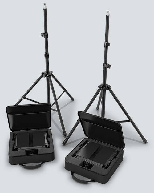 A removable filter widens and softens the light output. The pack comes with a 100 to 240 VAC power supply, so it's ready for worldwide use, but you can also run it on NP-F-type batteries when AC power is unavailable. The pack comes with two light fixtures with barndoors, two light stands, two external power supplies, and two carrying bags.