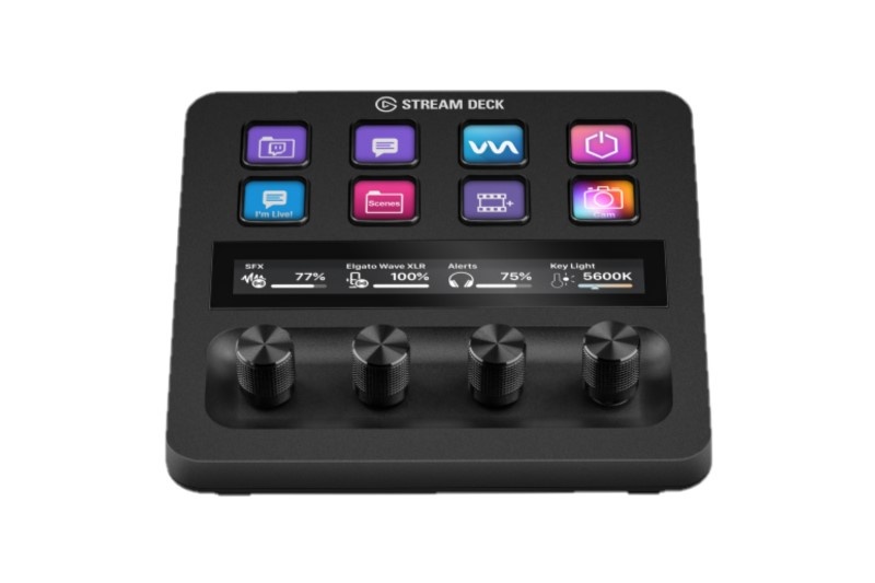 Add easy audio and video streaming workflow control to your macOS or Windows desktop with Stream Deck + from Elgato. Integrate all your tools, detect and switch scenes, or launch media sources using eight LCD keys with vibrant colors, custom-designed icons, and screensavers that can be programmed and arranged to your specific layout needs, giving you power and control with the mere tap of a single key. The console also has four programmable knobs that can control volume, virtual color sliders, and more. A touchscreen LCD strip in the middle provides additional programmable touch-control options.