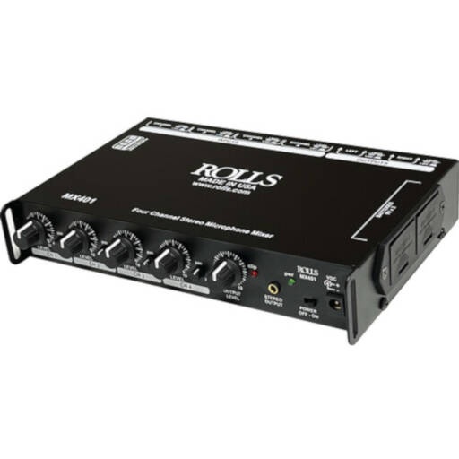 The MX401 mixes 4 microphones or line level XLR′s into two balanced Stereo outputs. The four XLR inputs, each have individually switchable phantom power, MIC or LINE level switch, Level control, and a Pan control. Two independant balanced, XLR outputs both with selectable MIC or LINE level. 1/8" inch Stereo Aux/Headphone output has been provided along with a Clip indicator, Power indicator, and Power switch. The unit is also powered by two 9-Volt alkaline batteries or the included 15VDC power supply. The MX401 replaces the previous MX124.