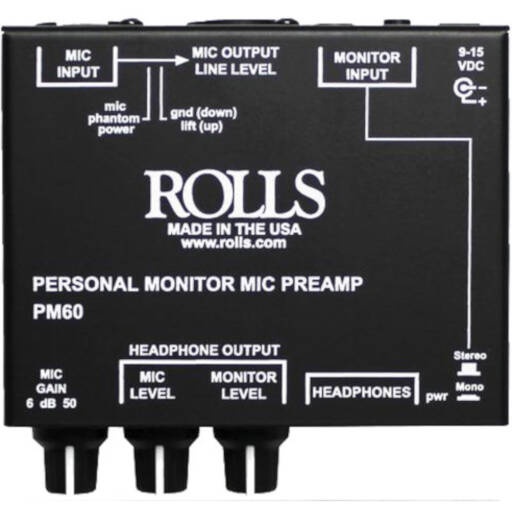 The Rolls PM60 is an all in one Personal Monitor headphone amp with a fully functional Microphone Preamp built in. Now there is a way to have a personal monitor without the need for a dedicated mixer board with a mic preamp and microphone phantom power. The PM60 has all those features built in. The PM60 has many uses other than personal monitoring, it can be used as a stand-alone mic preamp with headphone monitoring, it can be used as a mic monitoring headphone amp for direct recording, and it can also be used as a two channel mixer with stereo line 1/4" or 1/8" out. It is perfect for podcasting, home recording, mixing, boom mic monitoring for camera recording and mixing, or as a stand-alone personal monitor. The PM60 is an all in one unit that has many capabilities. Made in the USA, with an all steel chassis, the PM60 is built to last.