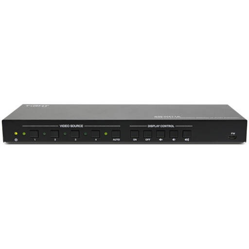 This switcher also features user friendly automatic switching and display control - no need for a separate control system. The switcher can also be manually controlled by the front panel buttons, IR remote, TCP/IP and RS232 command. The SW-H411A features a web UI for configuration and control. The Web UI can be set up to accessed from anywhere for easy support.