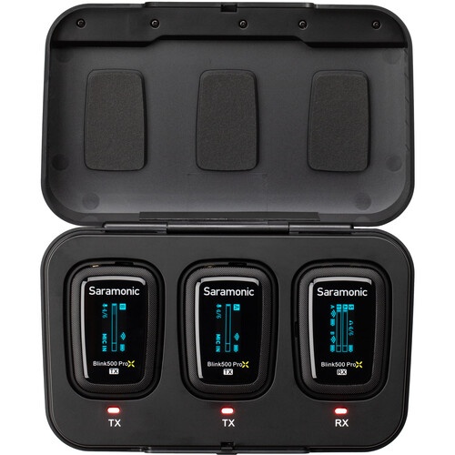 Ideal for content creators, videographers, journalists, vloggers, podcasters, and live streaming, the black Saramonic Blink 500 ProX B2 is a true-wireless, digital microphone system that offers a complete, cost-effective solution for recording clear-sounding dialog, interviews, and speech with two people talking simultaneously—directly to a mirrorless/DSLR camera, recorder, mixer, and other 3.5mm-input devices. The Blink 500 ProX is the next generation of the popular Blink 500 Pro system. It serves up some notable improvements, including higher digital-audio quality, smaller and lighter, updated design, lower latency/voice delay, more wireless reliability, upgraded OLED displays with real-time metering, longer battery life, and more.