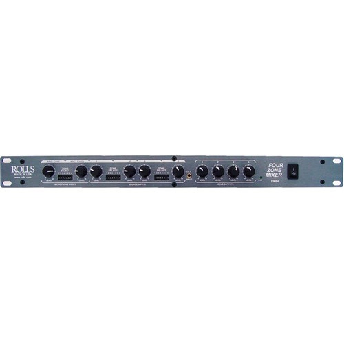 The Rolls RM64 Four Zone Mixer is ideal for use in restaurants, banquet rooms, offices, and other similar venues that need a mix of microphone and source signals sent to multiple rooms. The RM64 has two mic and four line-level source inputs, which can be sent to any combination of four output zones. All four outputs have balanced XLR connectors and accompanying 1/4" jacks for external volume control. The mic inputs have automatic ducking for easy paging.Two XLR mic inputs with individual volume controls, zone selector switches, and automatic ducking