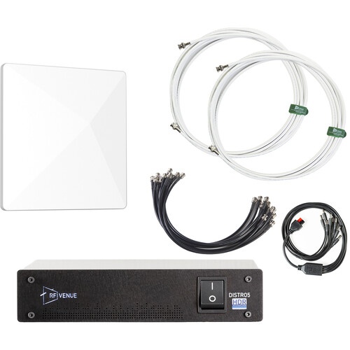 • Improve the reception and reduce dropouts in your classroom, event space, or conference room wireless microphone system with the white Diversity Architectural Antenna and DISTRO5 HDR 5-Channel UHF Distribution System Bundle from RF Venue. This turnkey package conveniently bundles a stylish white wall- or ceiling-mountable diversity flood antenna along with an active, half-rack, 5-channel splitter capable of splitting the RF signals from the antenna's A and B diversity connections, amplifying them, and sending them to multiple receivers. The package also includes a pair of white 25' coaxial low-loss antenna cables as well as a 10-pack of 1.5' low-loss coaxial cables to distribute the RF signal. The included DC Octopus cable distributes 12 VDC power to the receivers, eliminating wall warts and the need for dedicated rack power distribution.